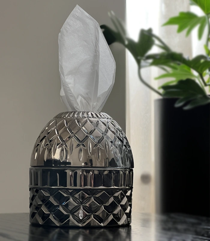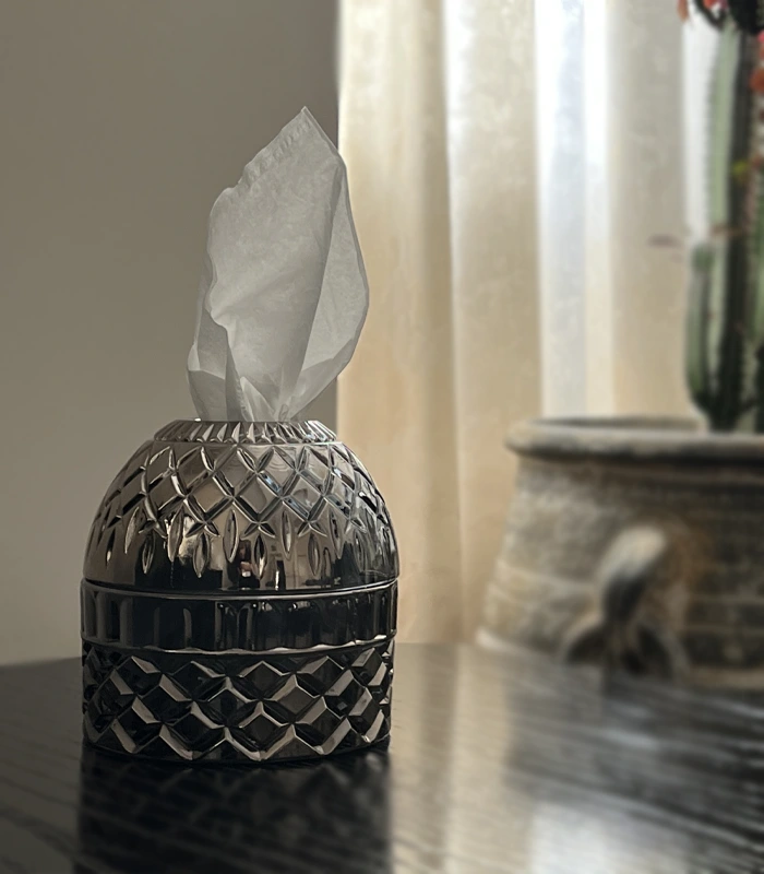 این جای دستمال کاغذی با طراحی الهامگرفته از الماس و استفاده از بلور شفاف و درجهیک، جلوهای خاص و چشمنواز به محیط میبخشد.